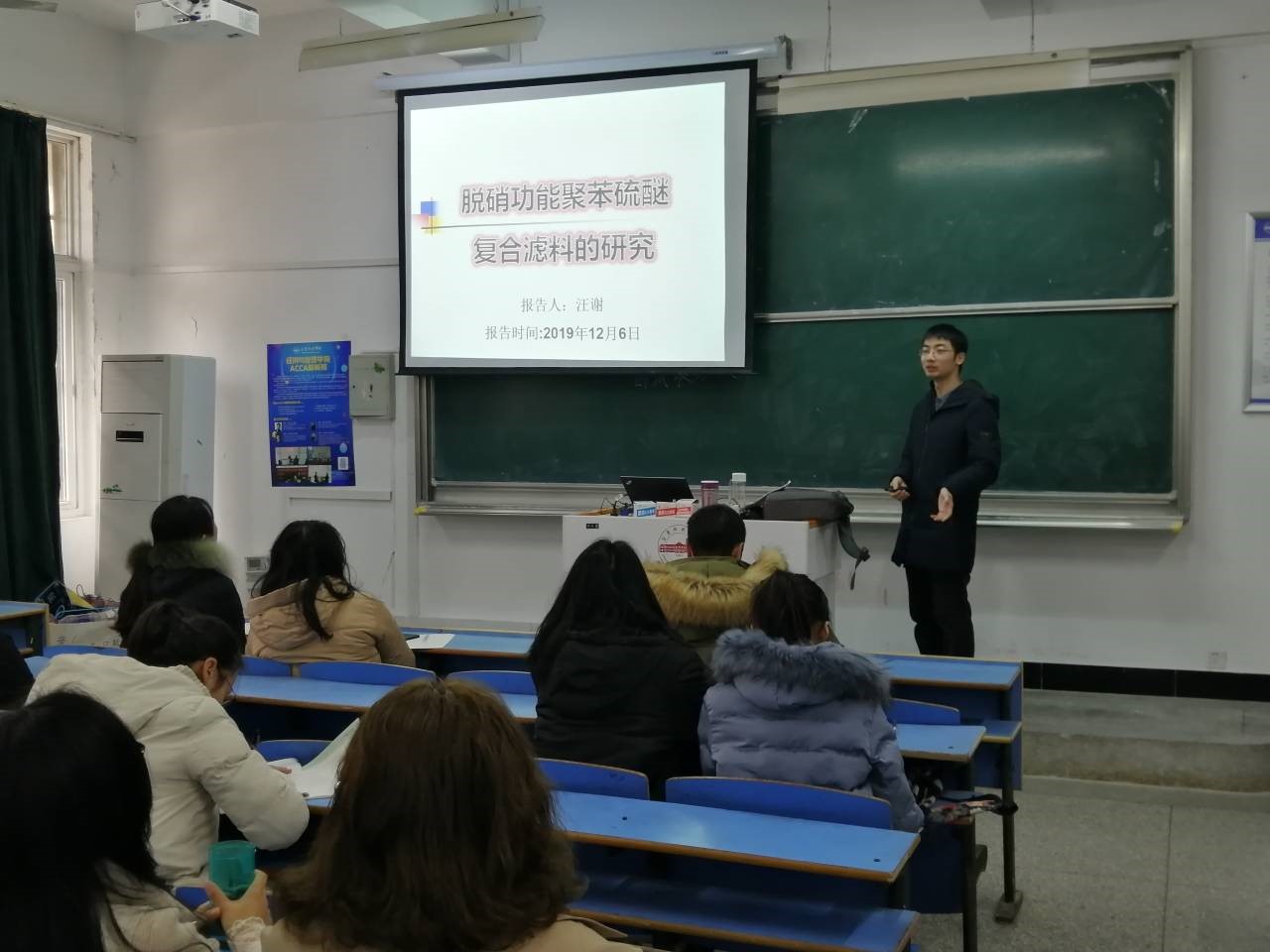 2019年12月6日上午10点,15vip太阳集团青年教师汪谢博士在龙山校区教学楼C105教室作了一场题为“脱硝功能聚苯硫醚复合滤料的研究”的学术报告,公司材料化学专业部分教师及16、17级部分本科生参与了这次学术交流活动。