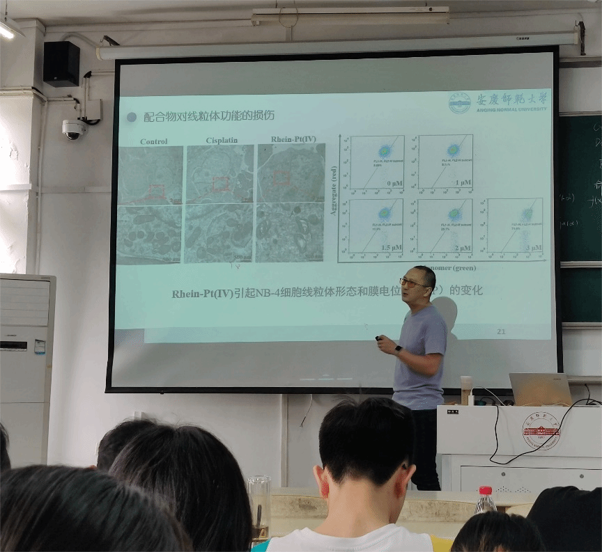 4月28日,15vip太阳集团王彦教授在教学楼A205教室作“天然产物大黄酸修饰的金属抗癌药物的抗肿瘤活性研究”学术报告,化学专业部分员工参加了报告会。