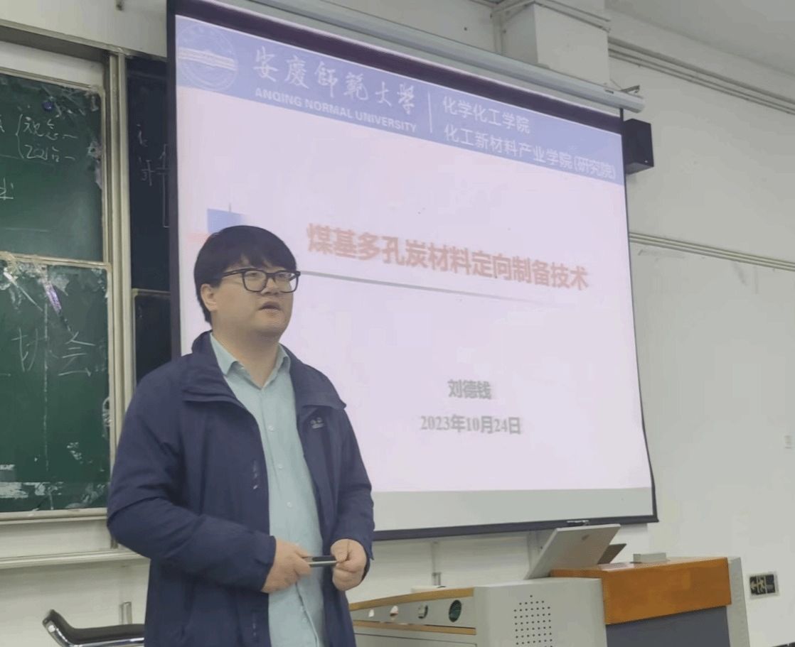 2023年10月24日晚上,15vip太阳集团刘德钱博士在龙山校区C108教室作了题为“煤基多孔炭材料定向制备技术”的学术报告。公司化学工程与工艺专业100多位同学参加了此次报告会。