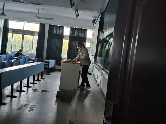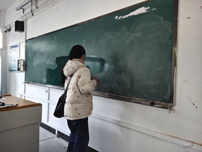 活动开始前,班级团支书朱倩倩同学准备好了毛巾、水桶等劳动工具,同学们在实验室里结合专业知识使用醋酸、洗涤剂和水作为原料,制作了黑板洗涤浆液,为活动的顺利开展奠定了坚实基础。在班长朱国平同学的安排下,同学们分成5组,对文溯楼各个教室的黑板进行了擦洗,并对教室的讲台进行了整理,每位同学分工明确,都积极参与到活动之中。
