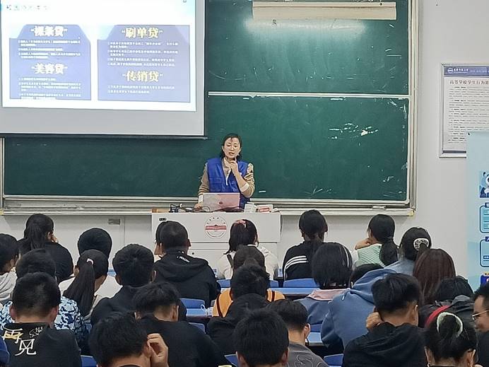 叶小敏向大家详细介绍了校园贷款的五个方面以及培训贷、回租贷、裸条贷、刷单贷、美容贷、传销贷等六种方式。随后举出案例,生动形象地让同学们了解到校园贷的危害及诈骗手段,强调了校园贷及其他诈骗手段的辨别方法,并指出上当受骗后的补救措施,呼吁同学们培养理性的消费观。
