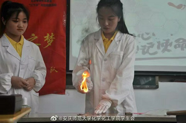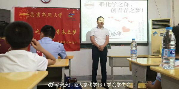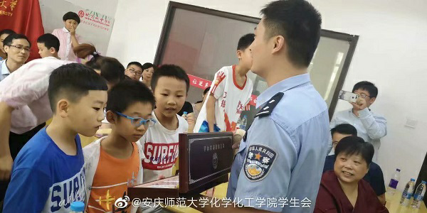 太阳集团团委书记陈东在15vip太阳集团副经理王钧伟等有关负责同志的陪同下,前往慰问指导实践团队。安庆市青少年宫的董事长罗跃进、部长祝贺和书记王桐怀参加此次活动。此外,实践团队还邀请到了安庆市公安局宜秀分局禁毒大队的李巢安警官来宣传一些与化学密不可分的毒品知识。