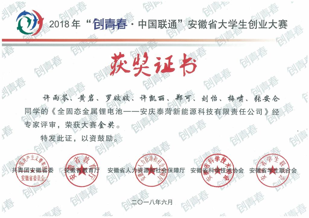 《全固态金属锂电池——安庆泰菏新能源科技有限责任公司》项目团队自去年11月份申报以来,刻苦勤奋钻研,充分发扬团结拼搏的团队协作精神。项目作品经过近百次修改打磨,项目团队多次去实验室进行实验,并走访企业调研。经过充分酝酿,安庆泰菏新能源科技有限责任公司于2018年5月在安庆市筑梦新区成立,现已入驻安庆筑梦新区工业园并开始科技孵化。该公司产业计划以全固态电芯制造为主,并逐步向中下游系统集成业务延伸,努力成为国内知名绿色能源解决方案供应商。在省赛决赛期间,经过专家评委书面评审、项目展示和现场问辩等环节的激烈角逐,最终成功荣获创业计划赛金奖。