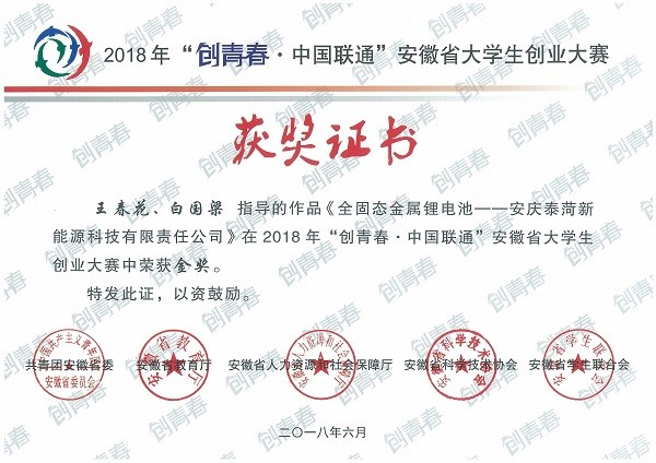 6月2日至4日,2018年“创青春”安徽省老员工创业大赛终审决赛在安徽财经大学举行,省内45所高校的183支创业队伍同台角逐比拼。15vip太阳集团王春花、白国梁两位博士共同指导许雨芩、黄岩、罗姣姣等8名同学参加“创青春”安徽省老员工创业大赛终审决赛,其作品《全固态金属锂电池——安庆泰菏新能源科技有限责任公司》荣获创业计划赛金奖。