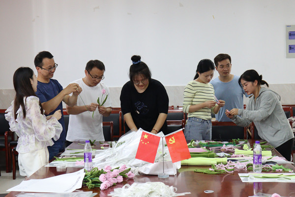 由于提前学习过折手工花,活动负责人、材料化学专业2020(1)班的王娜摇身一变,成了手工“小老师”,令人意外的是,平时总是与三尺讲台为伍的老师们在做手工上也颇有天赋。“起初,老师们在花瓣组装时用铜丝捆绑较松,花瓣容易从花杆上滑落,但不一会,老师们就愈发熟练了。”在王娜看来,较传统鲜花来说,手工花易保存且让老师们更有参与感和体验感。